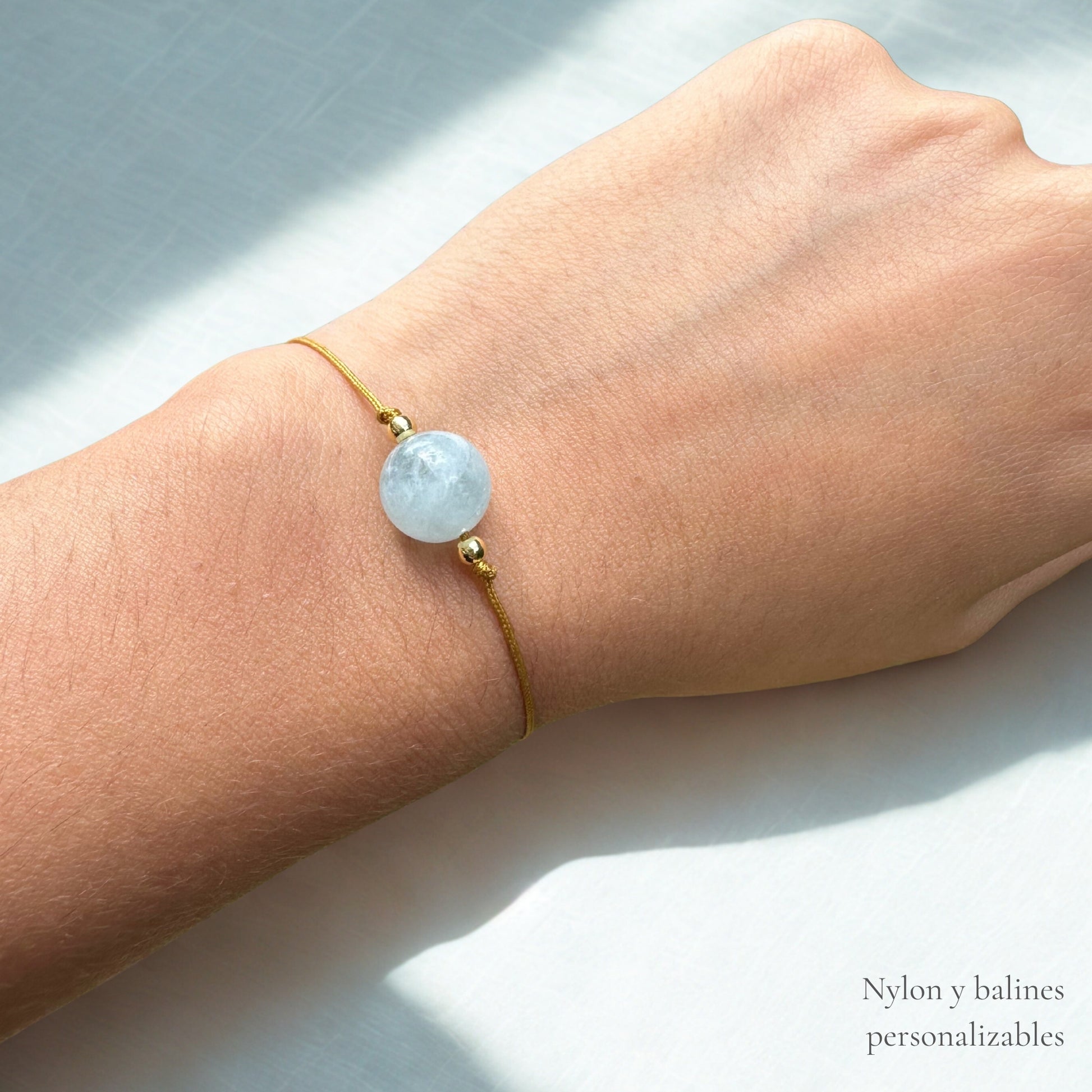 Designed with elegance, delicacy, and minimalism, this bracelet represents a unique touch of luxury for everyday wear. Handcrafted with nylon thread, 18k gold-plated details, and adorned with a beautiful aquamarine gemstone, this piece is perfect for reducing stress and anxiety.