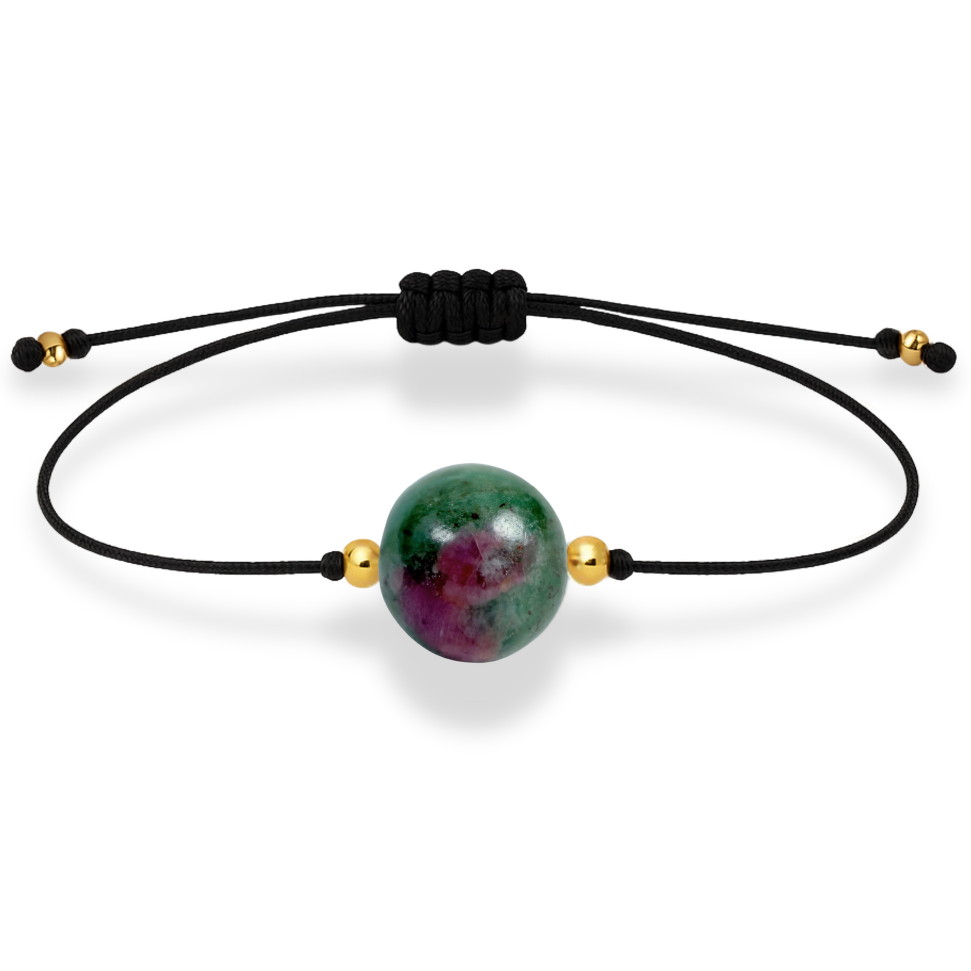 This minimalist thread bracelet with 18k gold-plated beads and a ruby ​​zoisite gem is a precious piece that offers style, elegance and a good omen of financial success.
