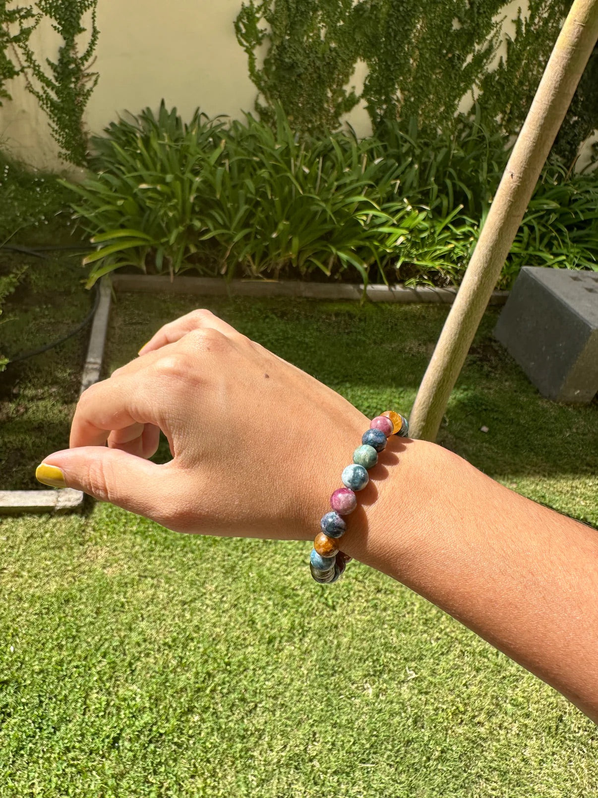 Complete the look with this bracelet of natural tourmaline stones carefully selected to possess the properties of the entire variety of colors of the different tourmaline stones to provide a modern touch, as well as a delicate spiritual energy. This bracelet is a reminder to travel in the right direction on your path to karmic balance.
