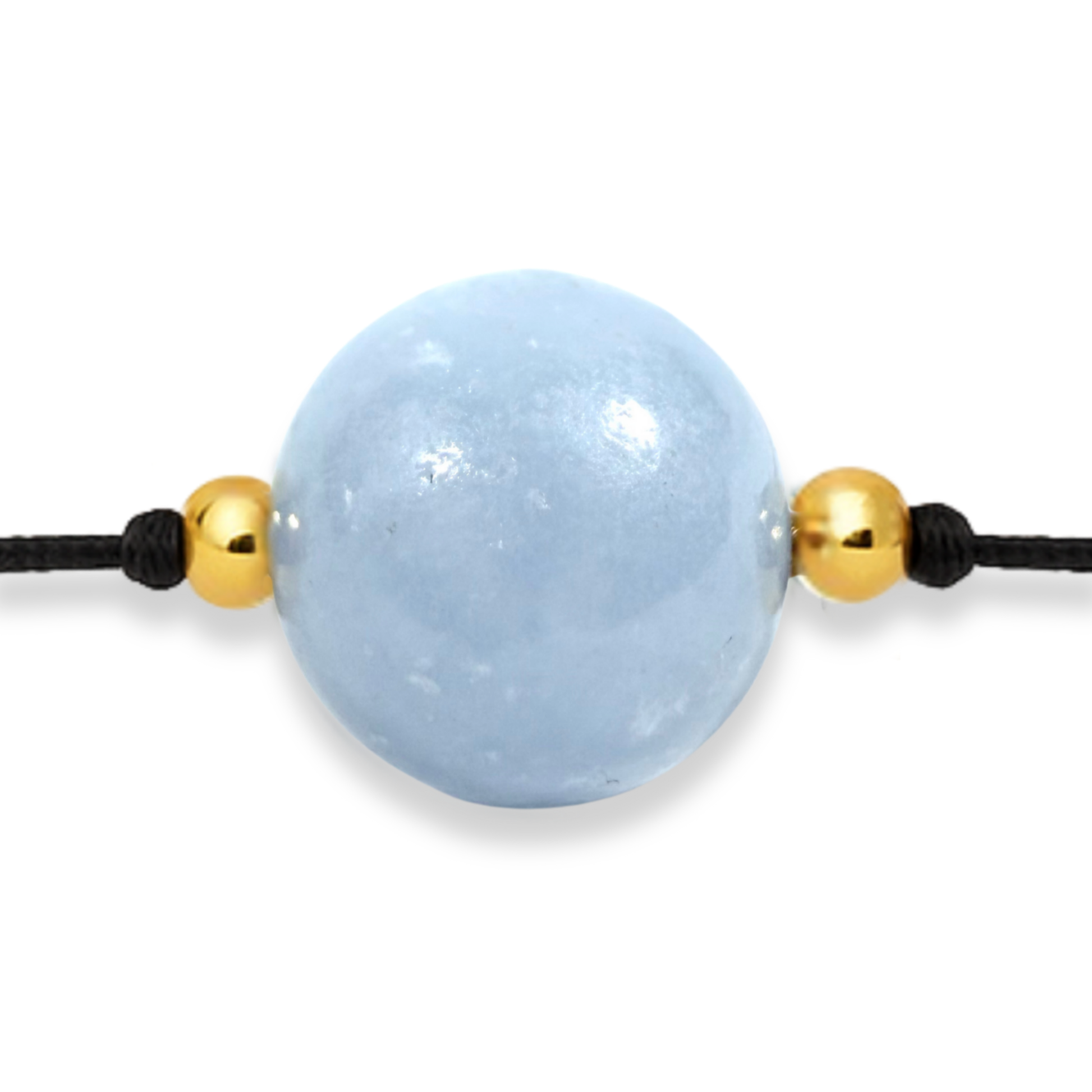 Appréciez la paix et la sérénité avec ce magnifique bracelet minimaliste en angélite bleue. Tissé à la main avec du fil de nylon, ce bracelet met en valeur une délicate pierre d'angélite bleue naturelle, délicatement entourée de perles plaquées or 18 carats. Symbole de paix et de sérénité, il deviendra sans aucun doute une pièce unique et précieuse de votre collection.
