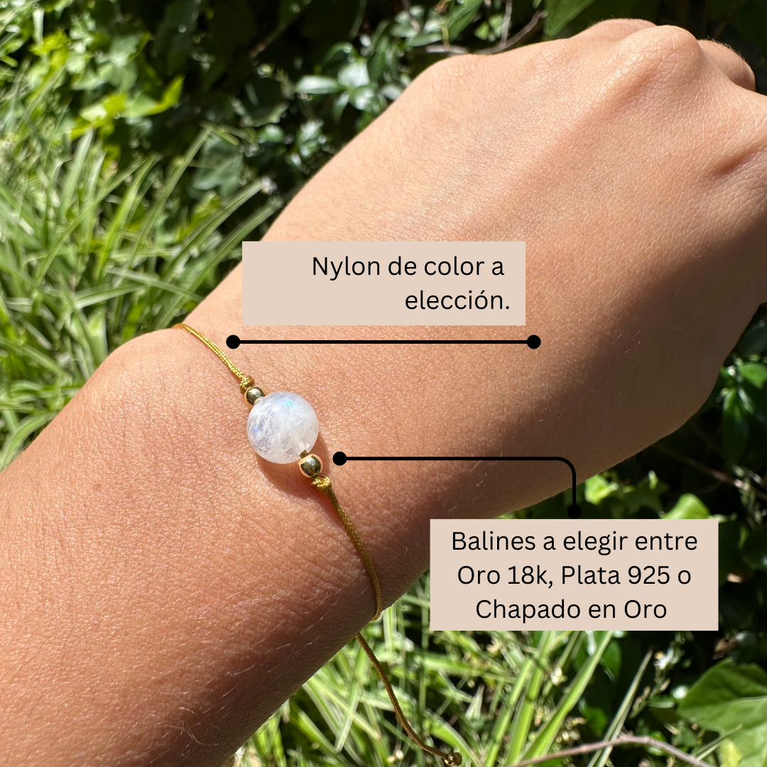 Descubre un nuevo comienzo con la pulsera minimalista Moonstone. Esta hermosa joya en tonos tornasoles está elaborada con hilo de nylon resistente y exquisitamente decorada con balines bañados en oro 18K y una preciosa gema de piedra luna. Una joya que te acompañará distinguidamente en tu nueva etapa.