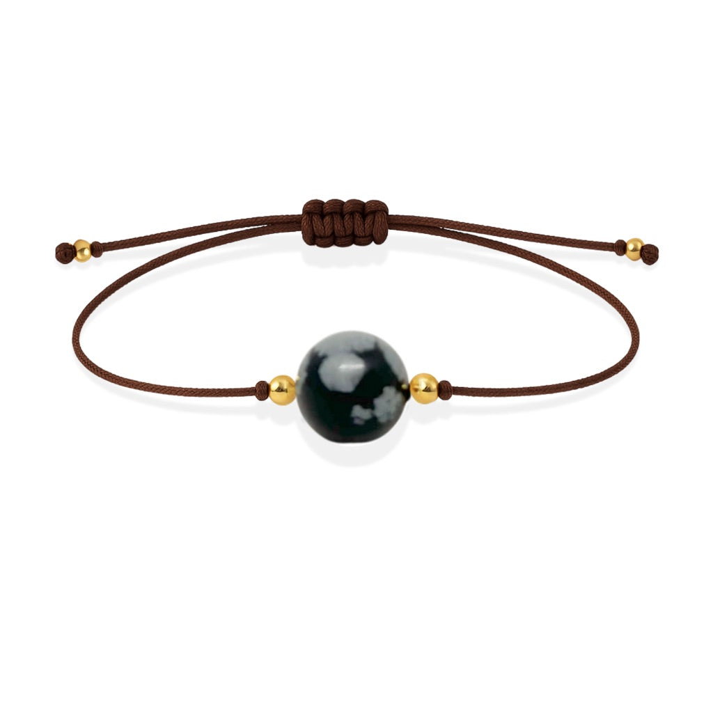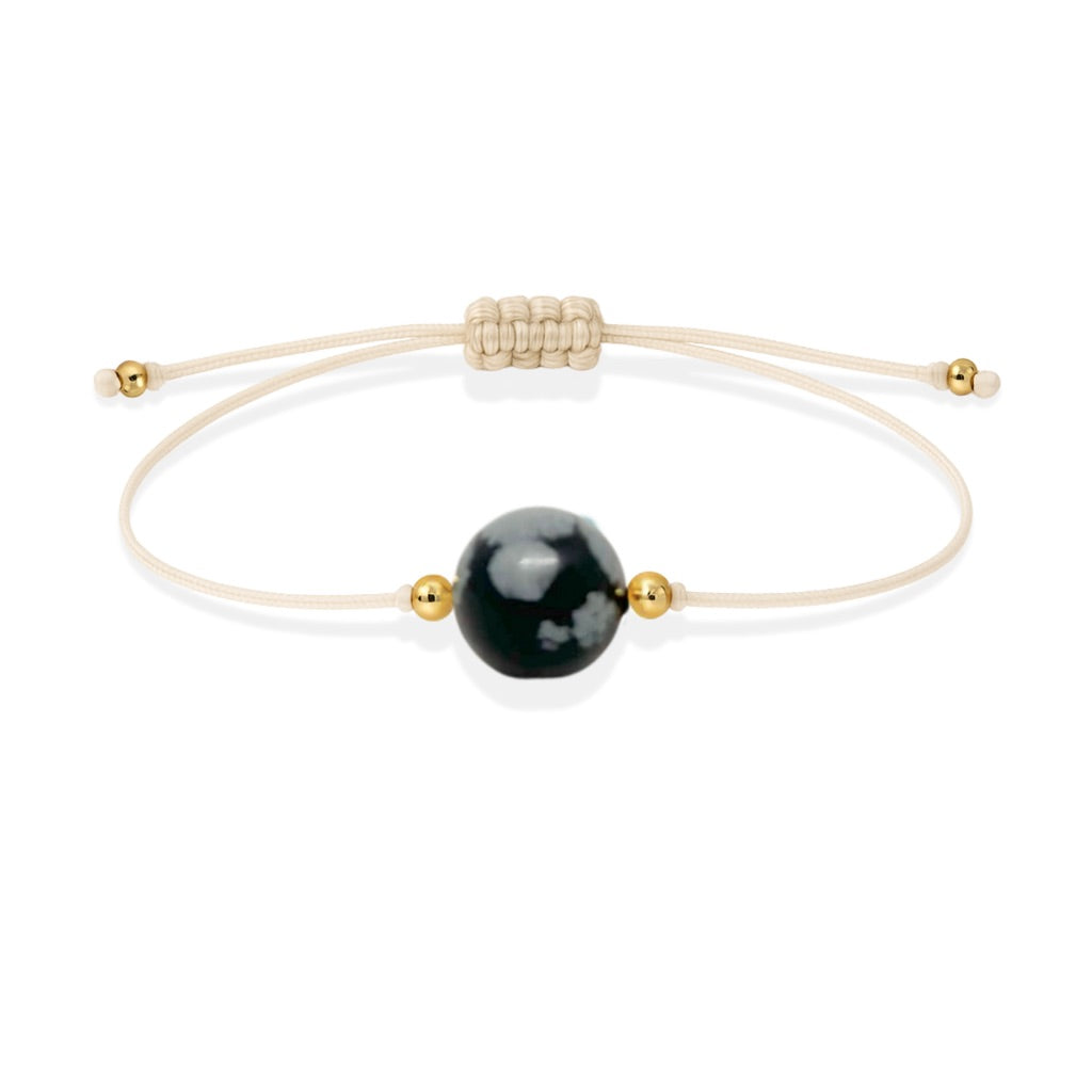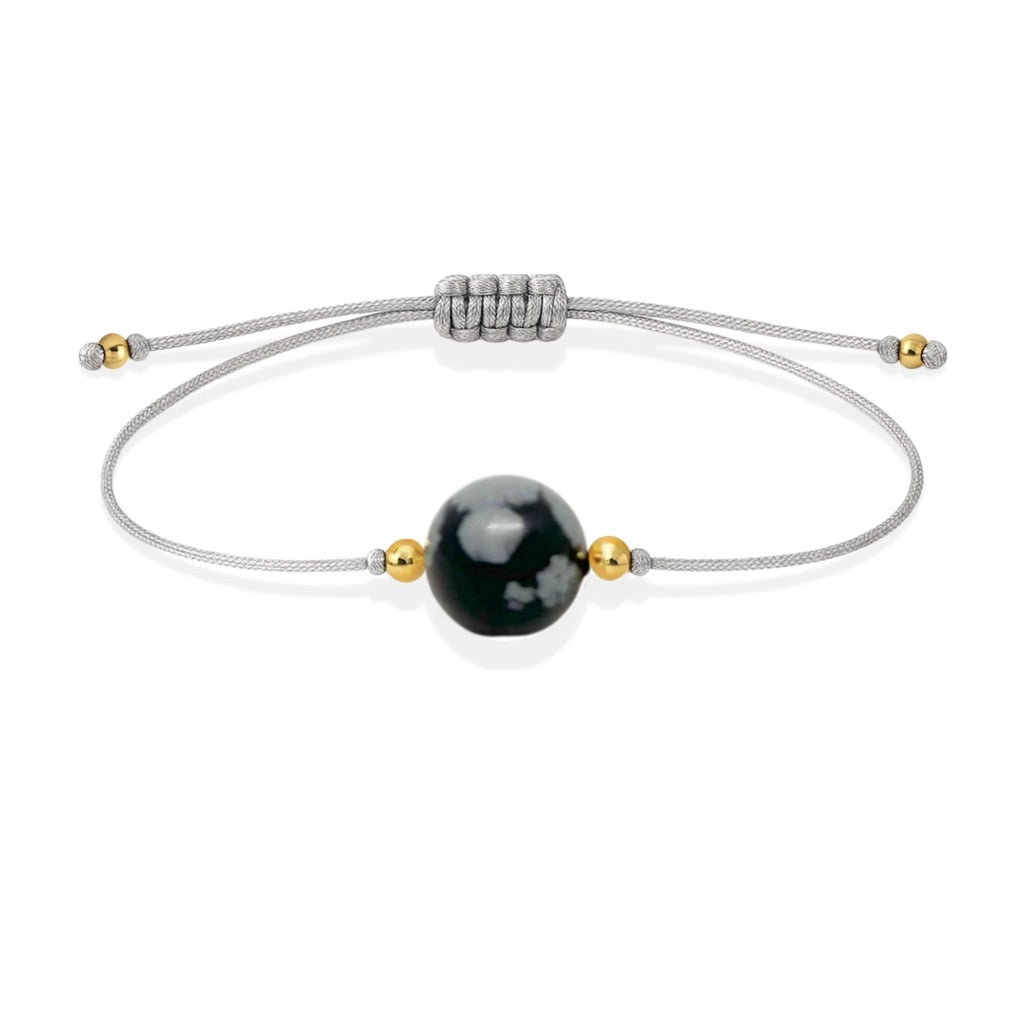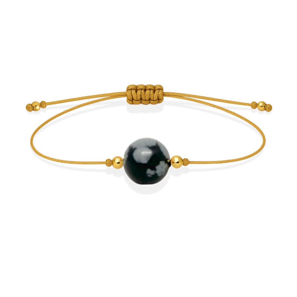 Diseñada exquisitamente para aquellos que gustan del estilo minimalista. Esta pulsera de hilo de nylon adornada con detalles bañados en oro de 18K encantará a los amantes de la elegancia. Perfeccionada con una única piedra de Obsidiana Nevada, esta pulsera ofrece un aura misteriosa para aquellos que la lucen. Una joya única e irresistible para los amantes de la moda sofisticada.
